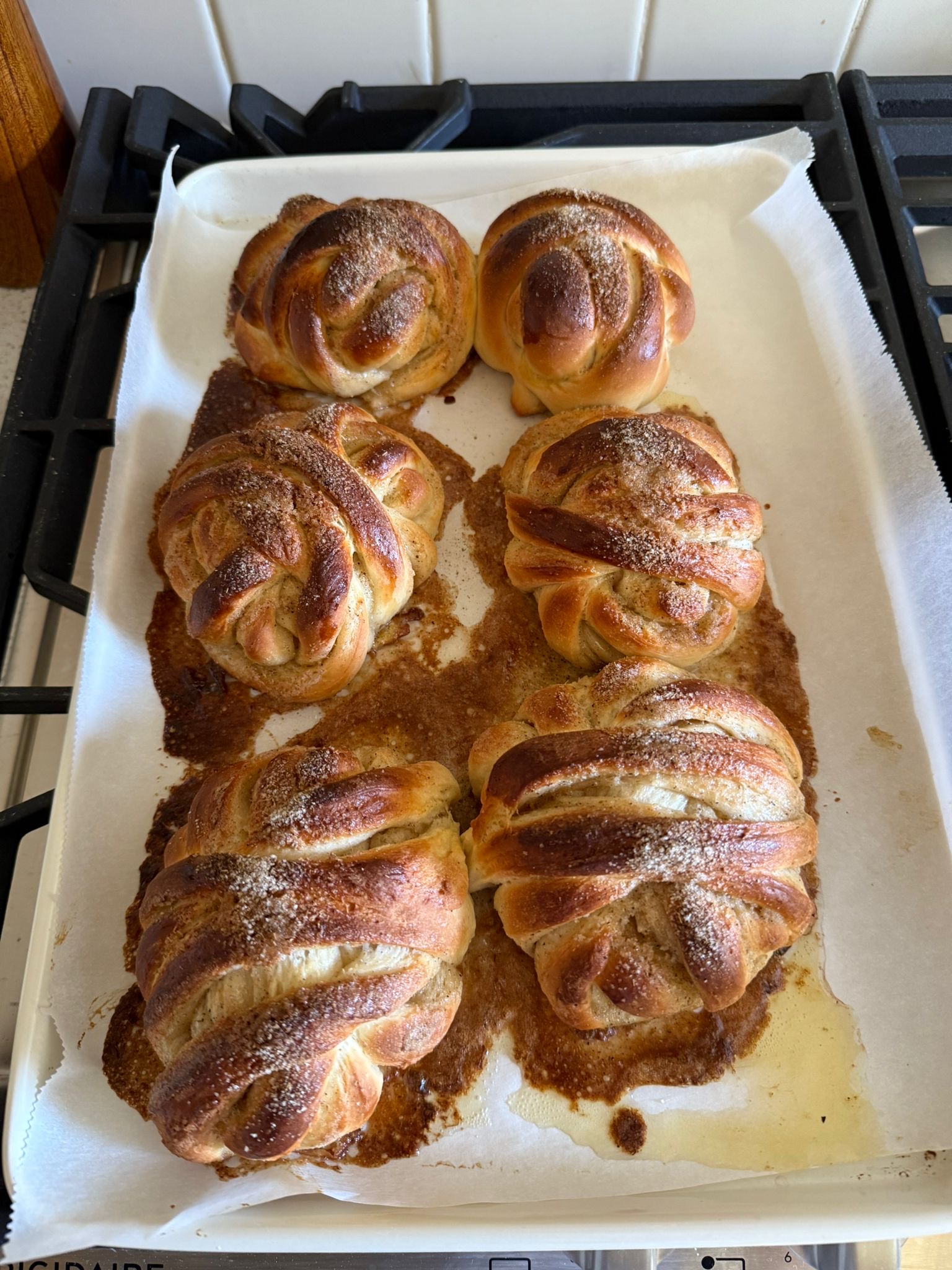Bake at 400°F or 205°C for around 20 minutes. You can eat warm or let them come to room temperature. The filling will have set into the dough to create a bread soaked in caramelized cardamom goodness. Eat the crispies left on the pan too!