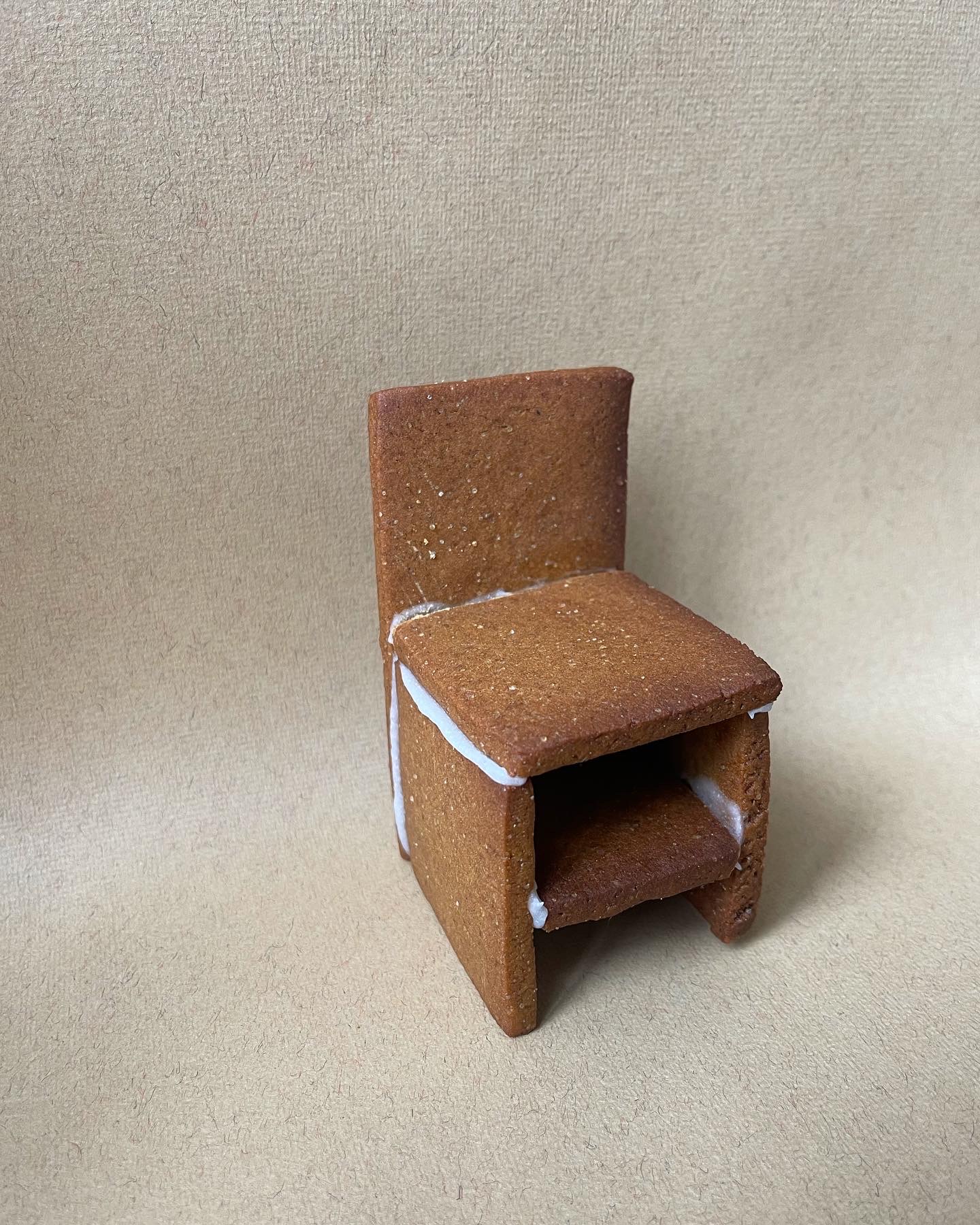 My mom used to give gingerbread house workshops to my siblings and I when we were little. Our friends started joining, and she quickly grew a following. By her third annual workshop, our elementary school took interest and asked her to participate in the Christmas auction. Mothers and fathers bid to have a seat for their children at the gingerbread house event. At her peak, my mom was giving workshops to 200 kids at once…a neighborhood legend. My dad practices carpentry as a hobby. He took me to Donald Judd’s home and studio in Marfa years back to research his furniture (and to try the breakfast burritos from Marfa Burrito.) Temperatures can drop below freezing during the winter in Marfa, and we were visiting in January. We were lucky enough to witness, for just a few hours, Judd’s stomping grounds dusted in snow. These GingerJudd Cookie chairs are for my parents. I used this gingerbread cookie recipe to construct the chairs. The cookies harden into gingersnaps which provide sturdy pieces for building. Also great in milk.